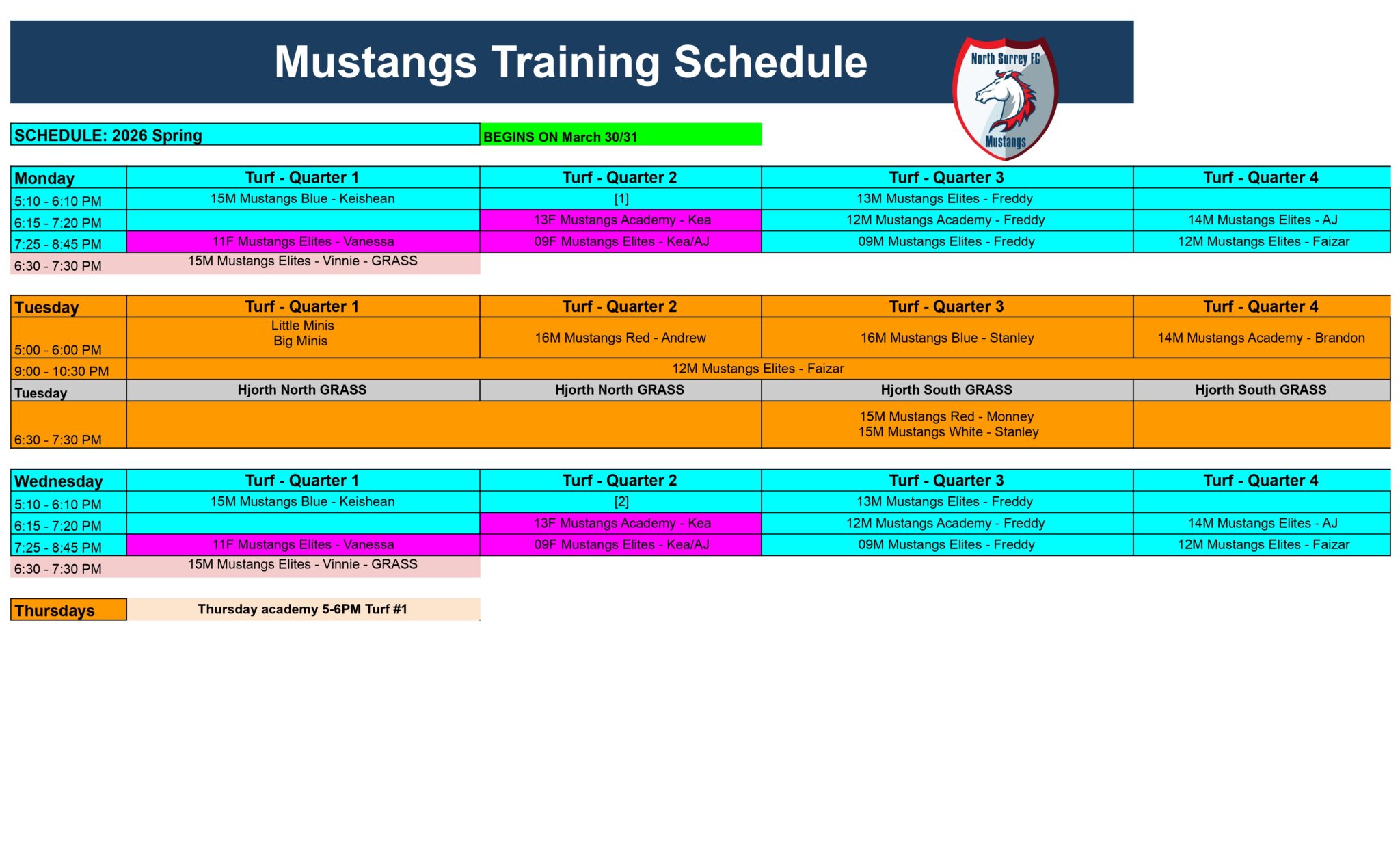 Current training Schedule
